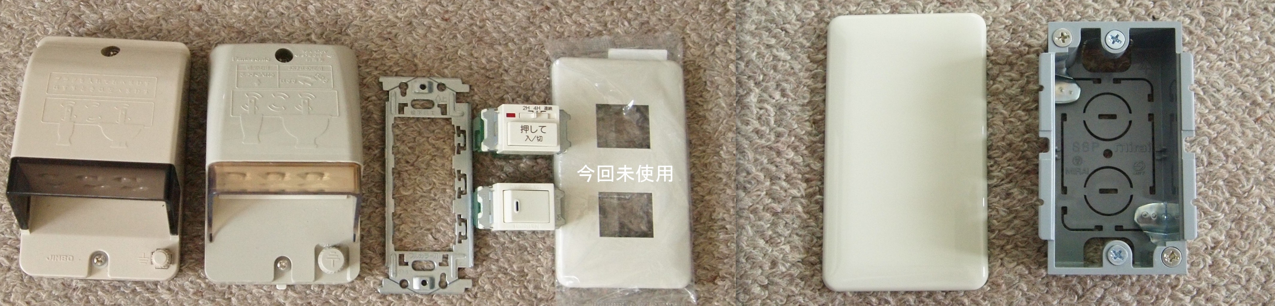 先日現場から帰宅途中に、現場の道具を購入ついでに、コンセント部材を購入。