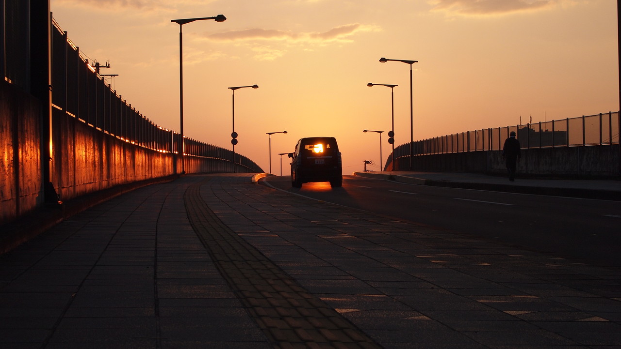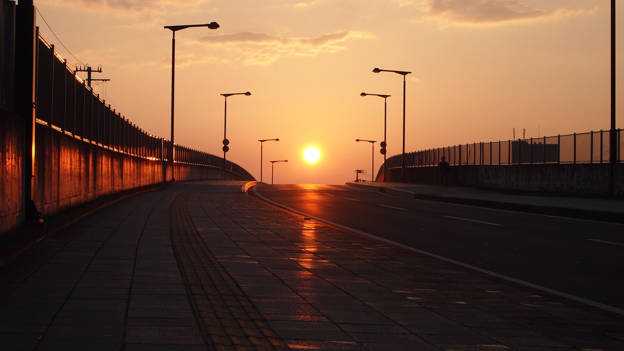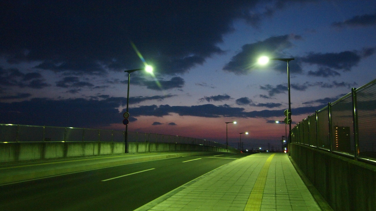 跨線橋の上で,白むできた東の空を見つめながら。