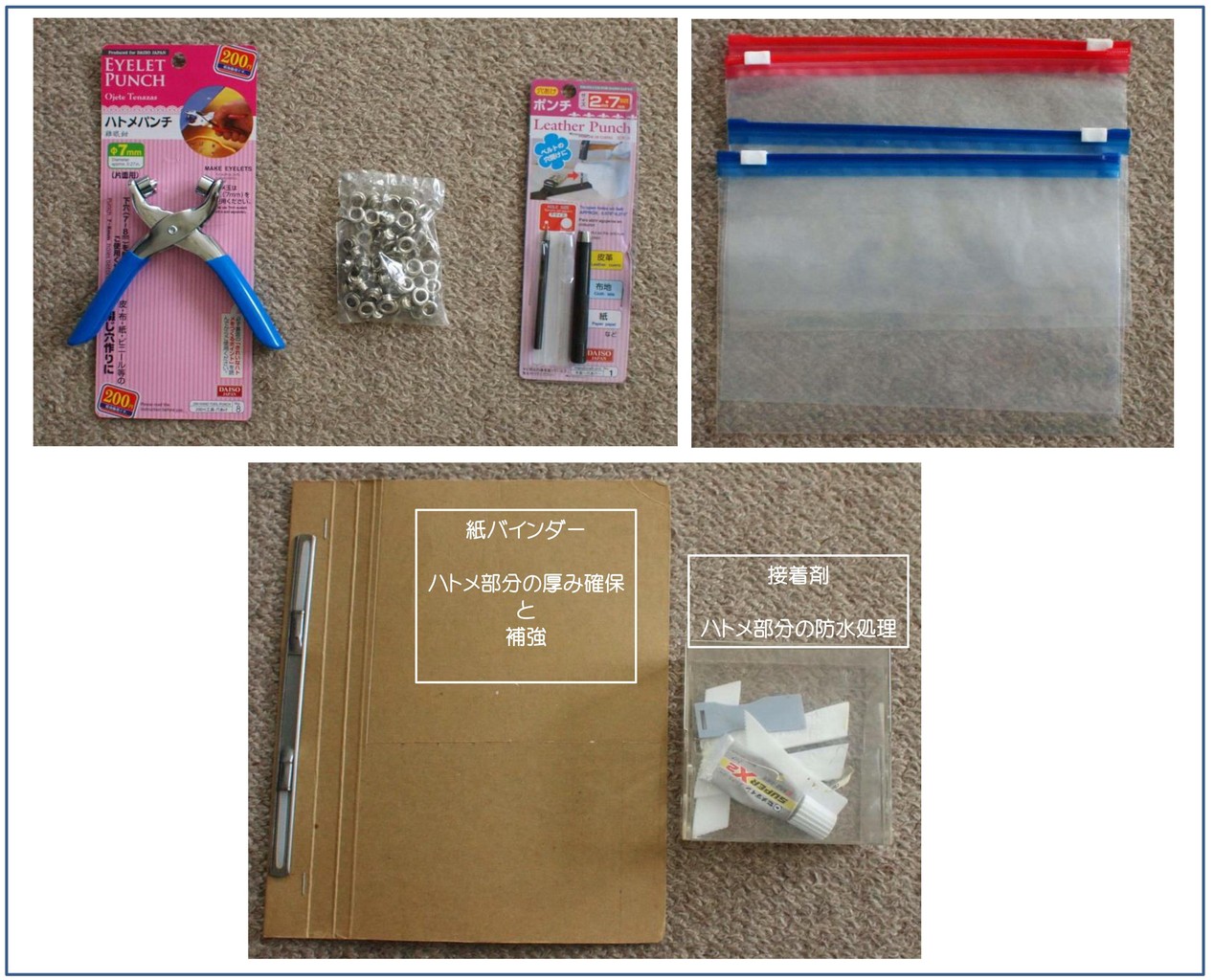 - ハトメパンチ(もどき) 200円 ハトメパンチは,カシメた部分がやっぱり今一でした。