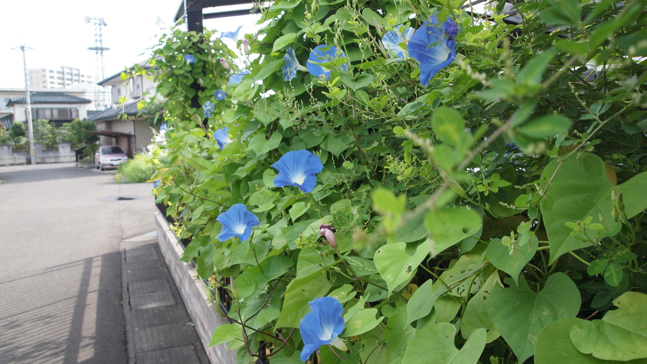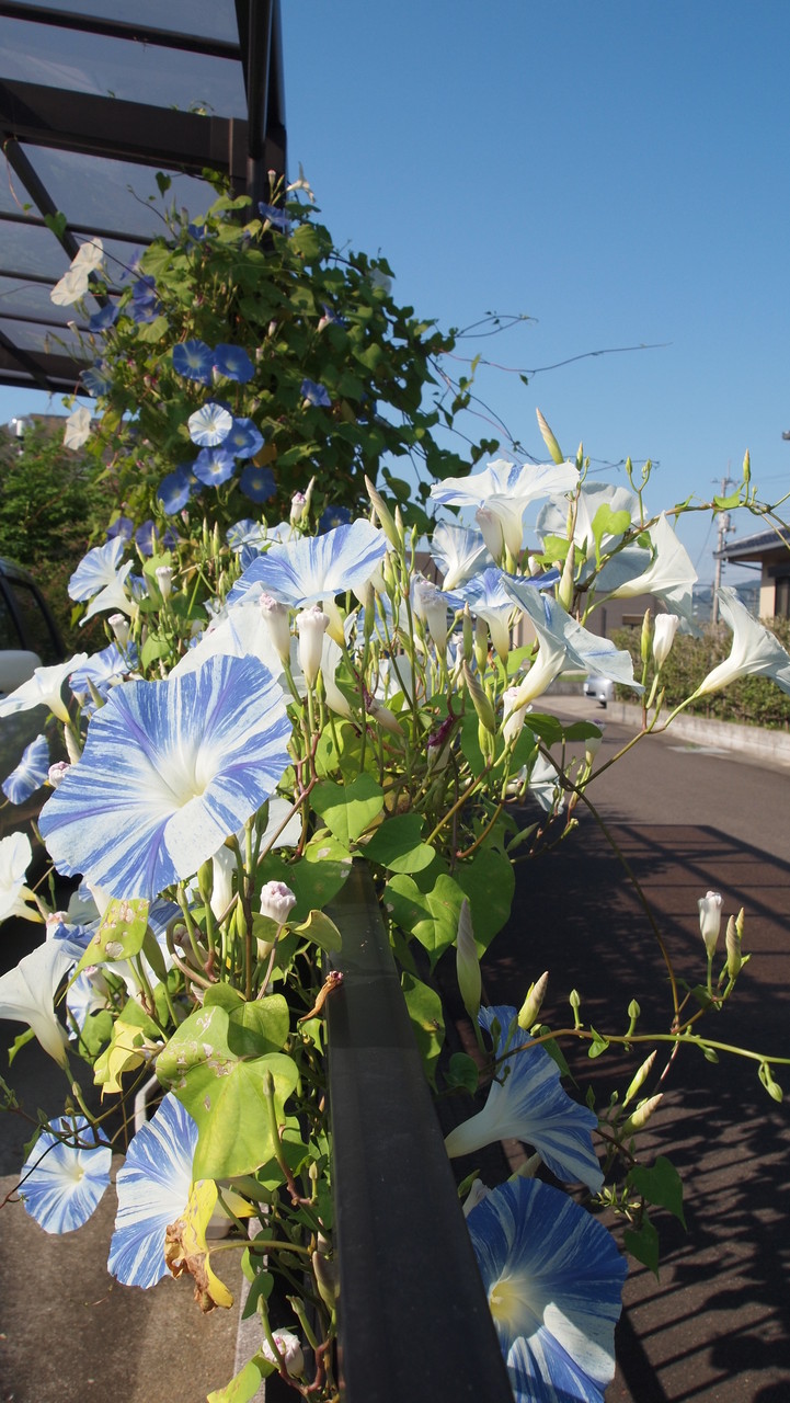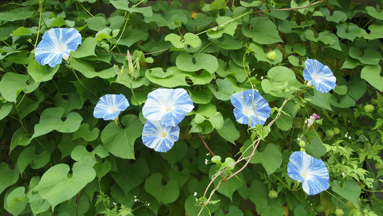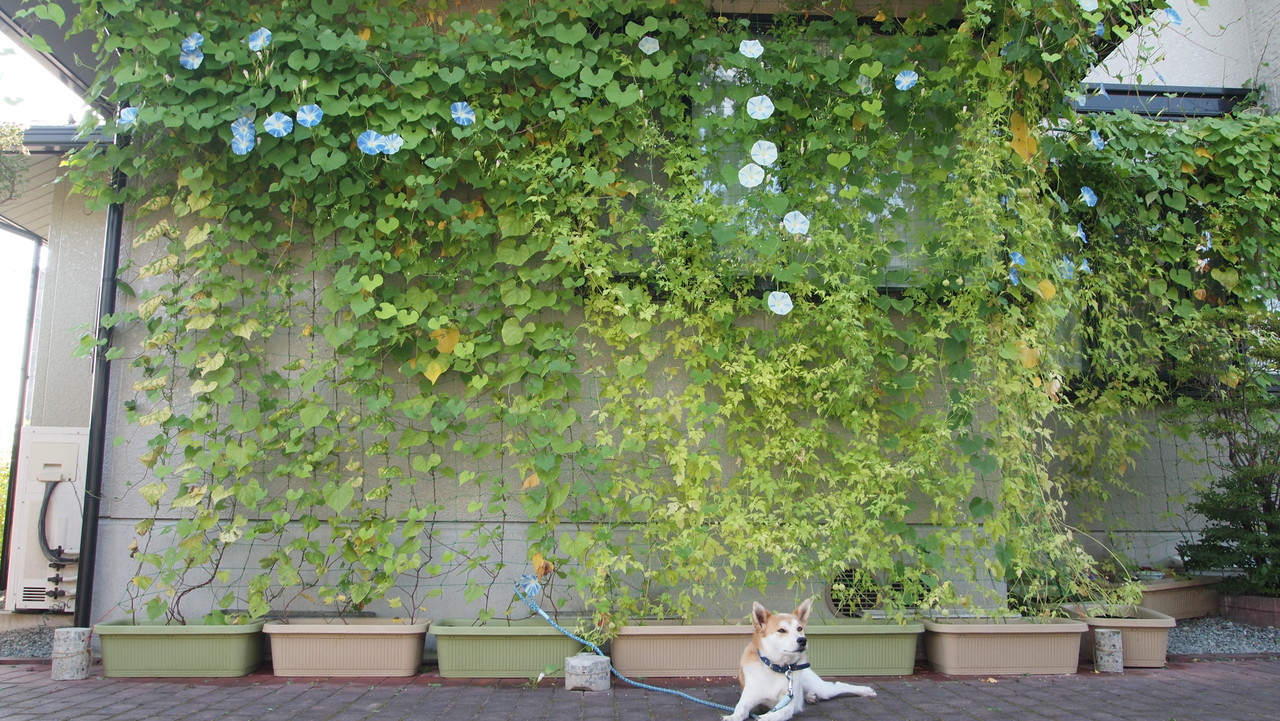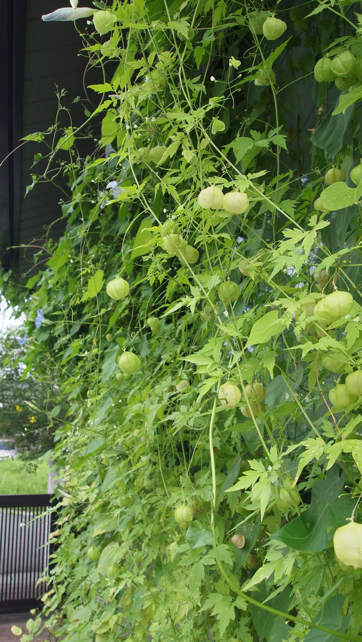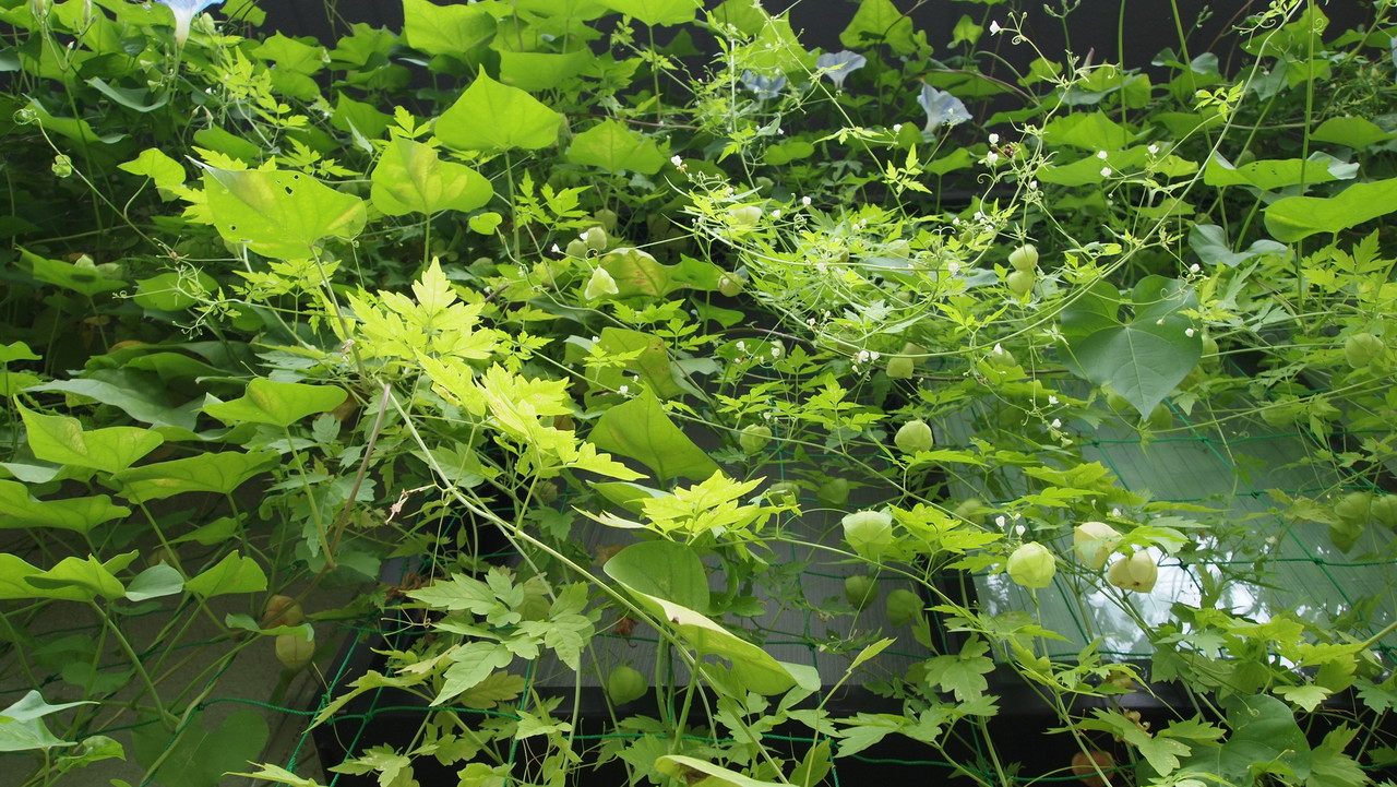 風船蔓・heavenly blue(西洋朝顔)・flying ssaucer(西洋朝顔)の緑のカーテンです。